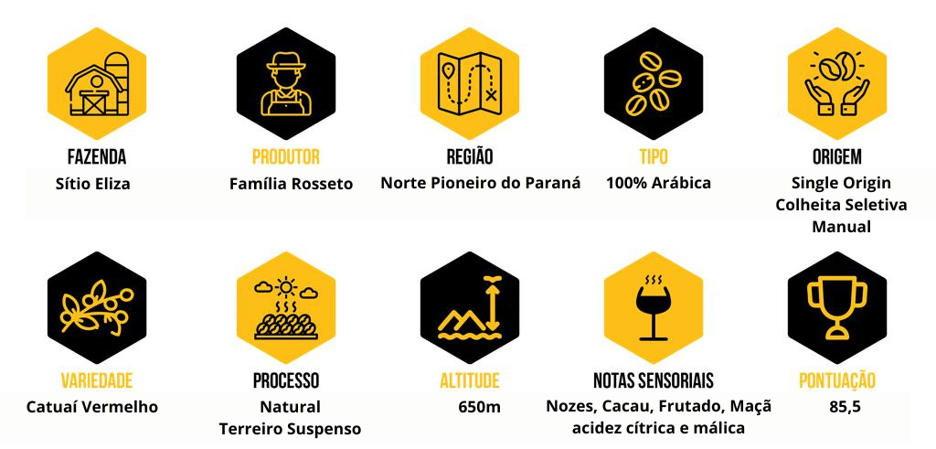 Cafézão nanolote do Norte do Paraná, região de Mandaguari, com notas sensoriais de Nozes, Cacau, Frutado, Maçã. Acidez cítrica de limão (quente), ao esfriar, acidez málica de Maçã-verde da variedade Catuaí Vermelho. Produzido pela família Rosseto, tradicional na cafeicultura paranaense, em uma altitude média de 650 metros. Por ser localizada na linha do trópico de capricórnio, faz com que a região produza um café de excelente qualidade. A fazenda já recebeu diversas premiações como por exemplo prêmio de 1° Colocado no Concurso Nosso Café By Yara – O Melhor Café do Brasil 2017 – Categoria Processo Natural.